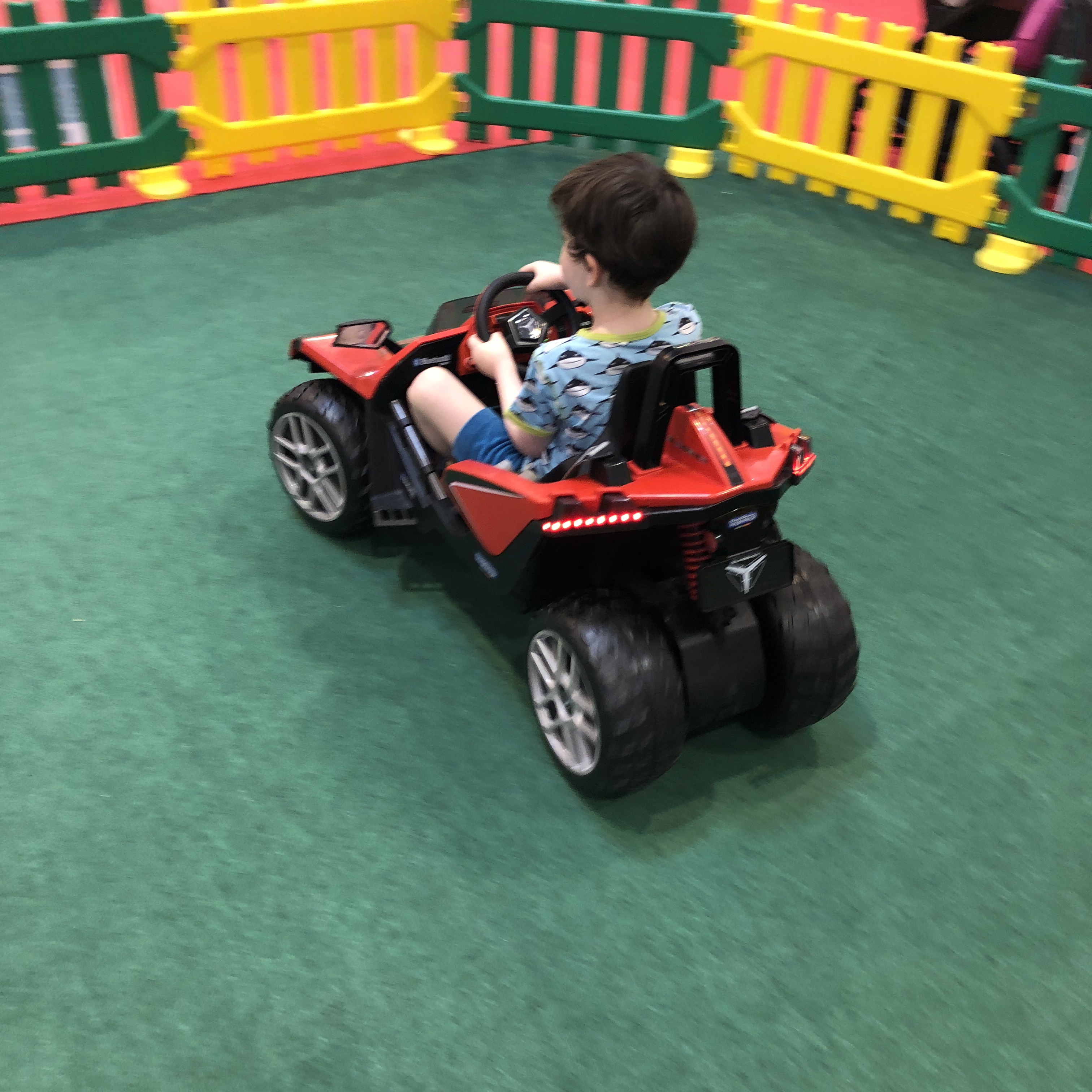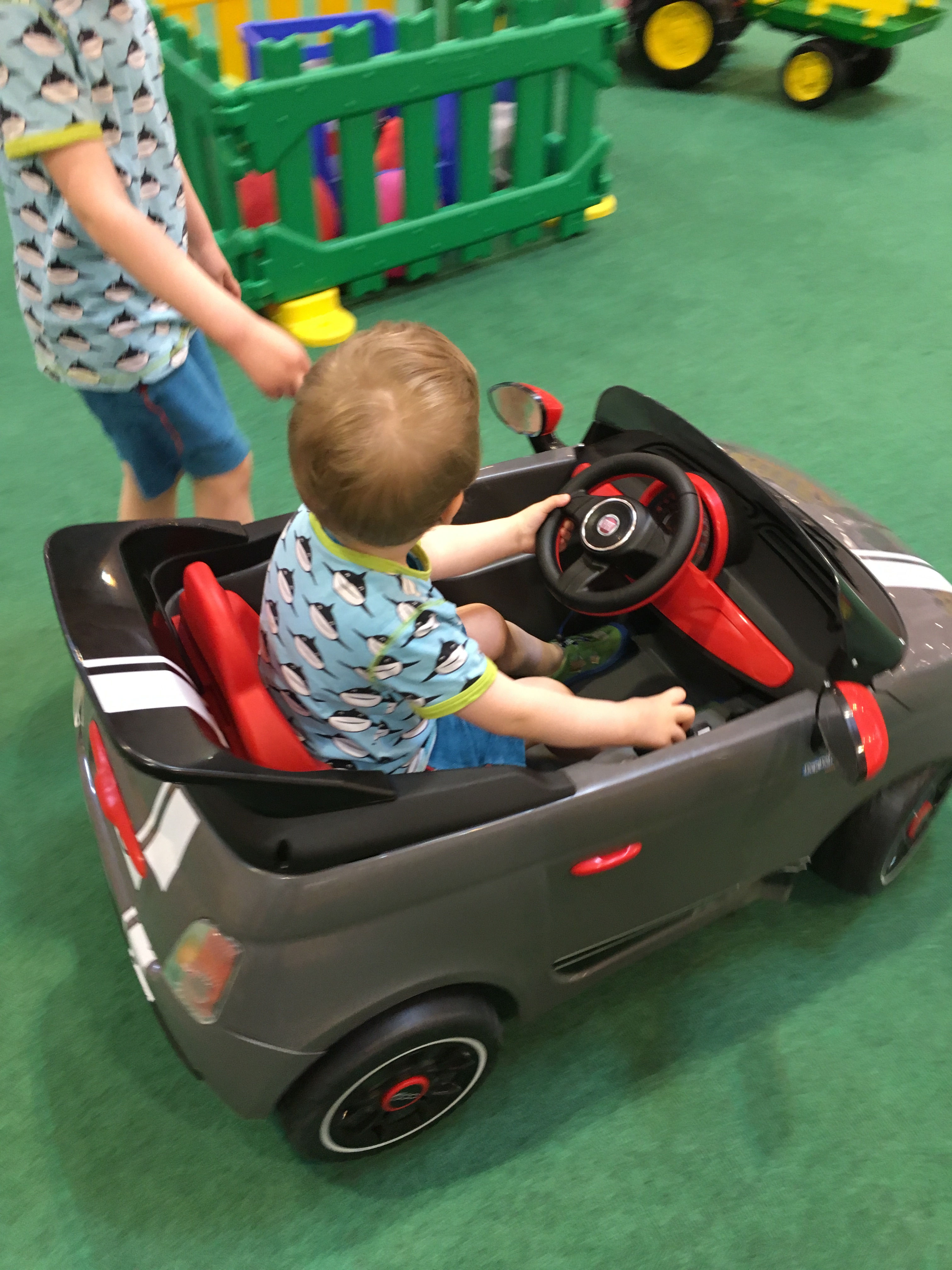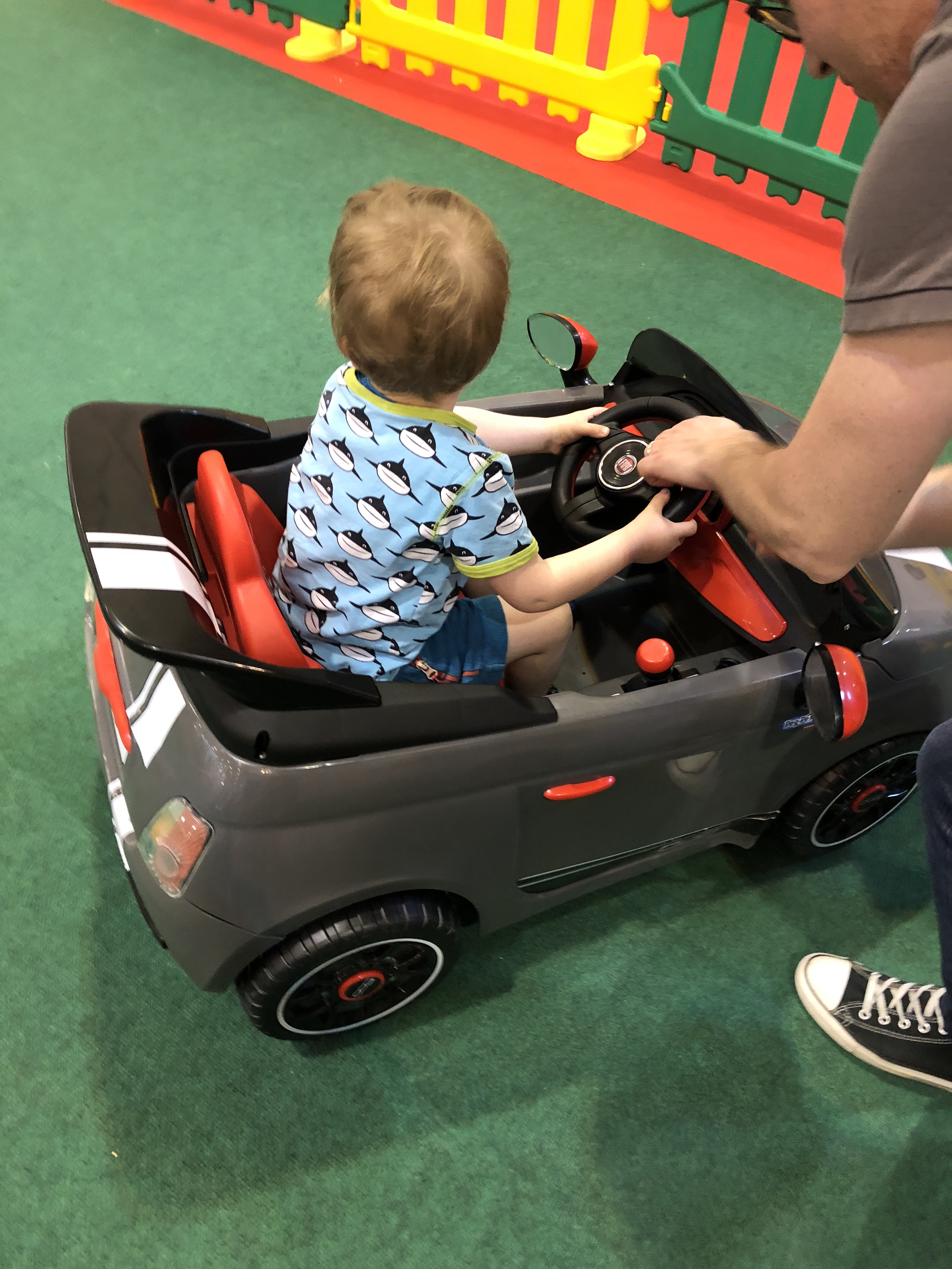 In der selben Halle war noch ein Spielbereich mit Elektrofahrzeugen, auf denen die Kinder kostenlos Runden drehen durften, für unsere beiden Jungs (der Große war mit dem Opa heute beim Schwebetrolleybahnseilbummel) natürlich das absolute Highlight. Direkt daneben war auch ein Essensbereich. In der anderen Halle gab es die Bühne und eine Hüpfburg. Daher macht diese Messe auch mit Kindern Spaß, einzig die Essenspreise sind sehr extrem. 4€ für eine Flasche Apfelschorle fanden wir happig. Es gab auch Waffeln und weitere Essensangebote, wir haben nur ein kleines Eis gekauft. Daher würde ich empfehlen, vorher zu essen oder danach. Unsere Kinder vermissten allerdings einen Stand von Wobbel oder Lego.
