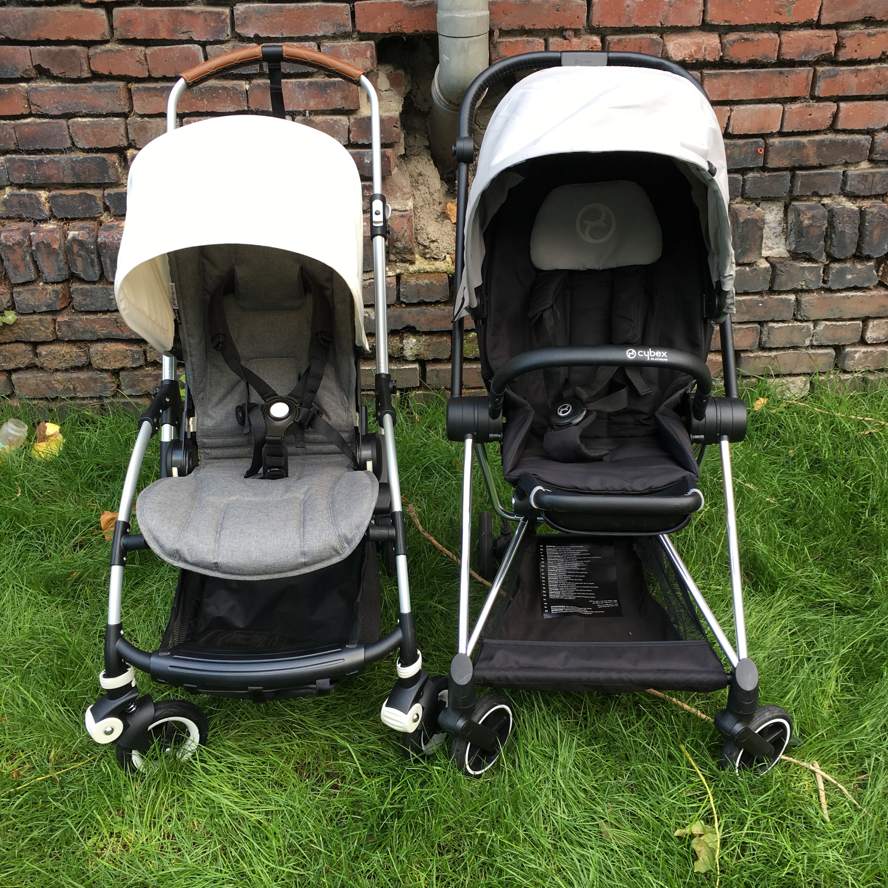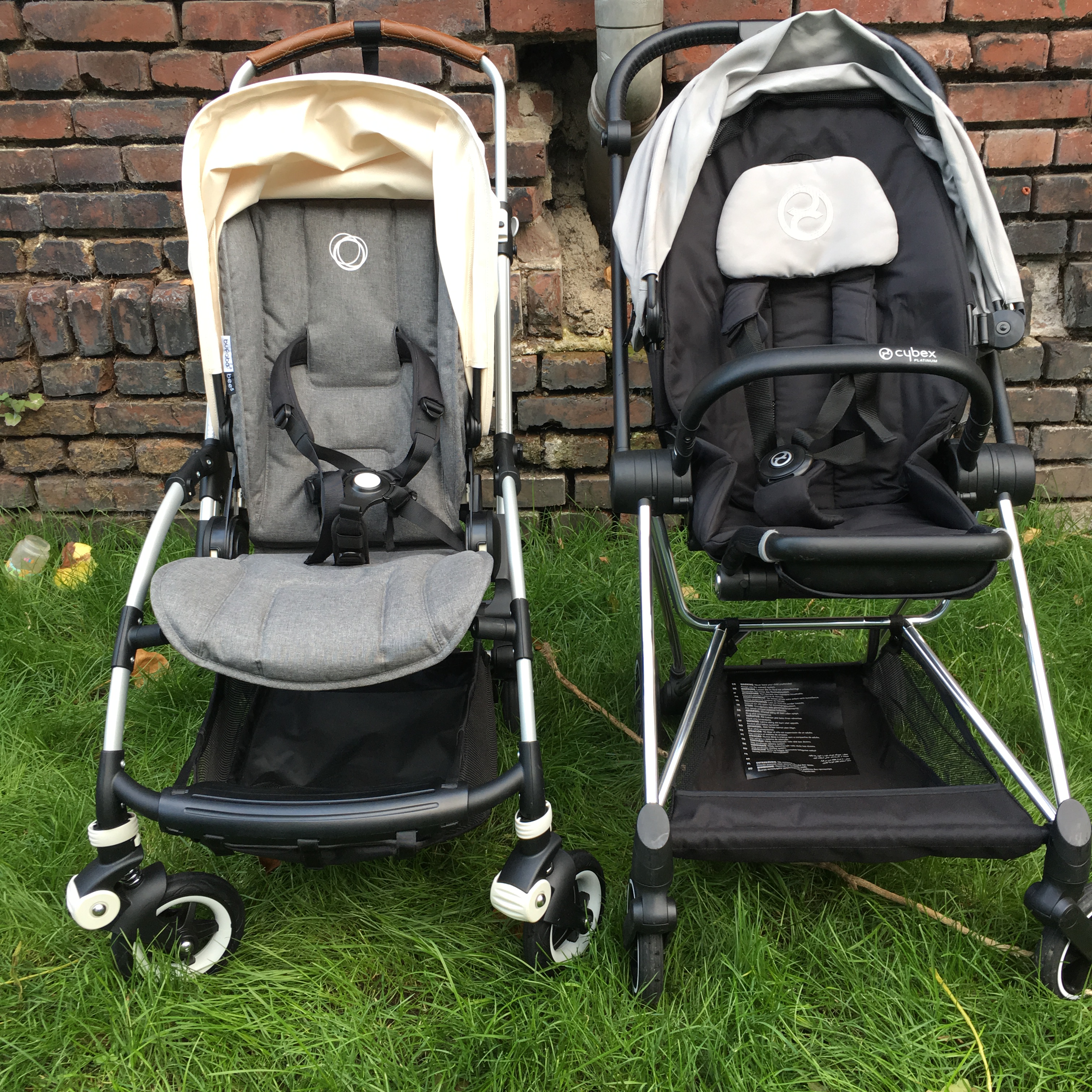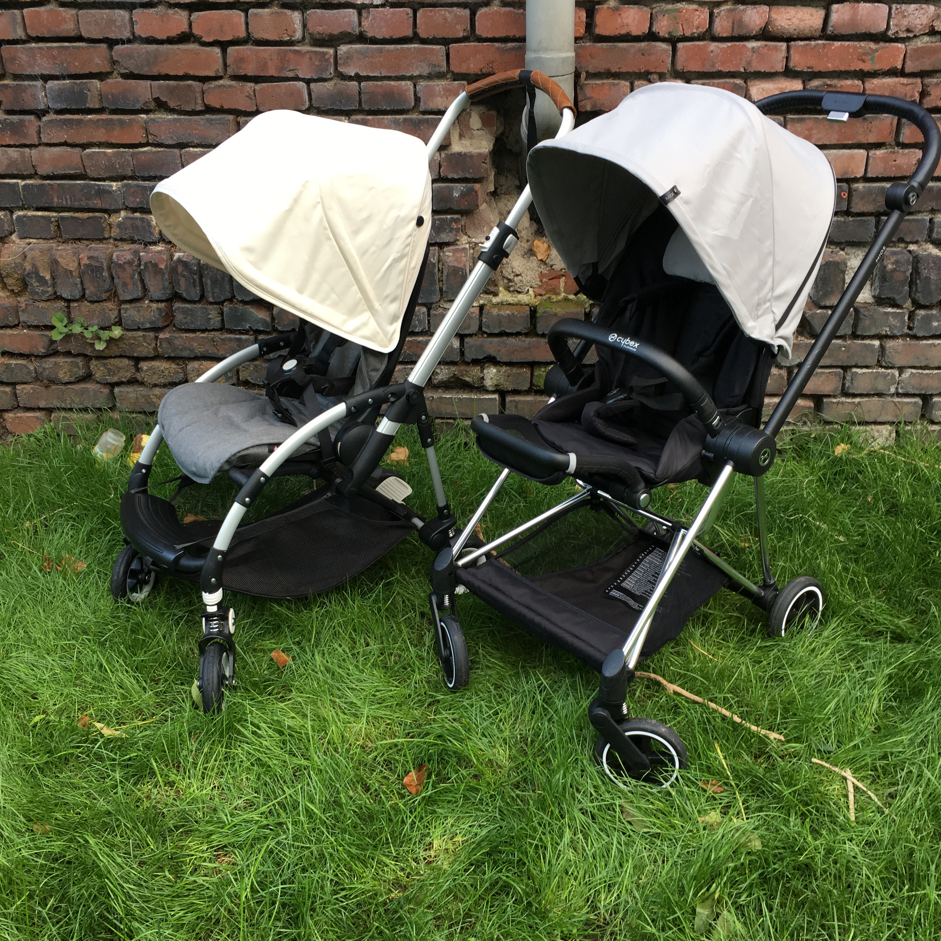 English summary for a few days we had the chance to compare the Bugaboo Bee5 directly with the Cybex Mios buggy. Please notice that the Bee5 has a Bee+ sun canopy in this pictures as my Bee5 canopy was delivered late. The two buggies have loads in common, both offer rather big seats that are suitable for small and for tall children, with both buggies you can easily change the seating position between world-facing and parent-facing. The Cybex Mios offers that option with the child still in the seat (please be careful though) while for the Bugaboo Bee5 you have to take the child out and fold the seat so it’s not a great option to change the position frequently during one outing. Both canopies are big and protect the child from sun or during a nap both also didn’t leak during short wet spells. The fabrics of both buggies are high quality although personally I prefer the Bugaboo fabrics, the canopy of the Cybex Mios looks creased easily. The comparison between the fold has an obvious winner: the fold of the Cybex Mios is tiny and it has a grip for carrying it around! The fold of the Bugaboo Bee5 is okay, too, but not as tiny as the Cybex Mios. Both should fit into most car boots. What didn’t impress me much about the Cybex Mios was the basket which it tiny. Really tiny. While in the basket of the Bugaboo Bee5 I can fit an average grocery shopping during the week. What I prefer about the Cybex Mios is the footrest though, it makes a much better sleeping position. Both buggies offer flat sleeping positions, are approximately the same width (50 centimetres) and same weight (ca. 9kg), have leatherette (read: fake leather) handlebars and have suspension on each wheel and a foot brake. The Cybex Mios has a bumper bar though which the Bugaboo Bee5 hasn’t. Although the Cybex Mios has a smaller fold I find the Bugaboo Bee5 a bit easier to fold down. Bugaboo offers special editions frequently so if you like swapping canopies and styles, it is easier with the Bee5 as there are more options, you can buy color packs for the Cybex Mios though, too. In my opinion the Bugaboo Bee5 is a bit easier to push, literally with one finger (on even surfaces) and I prefer the new Bugaboo harness. So, if the fold and the sleeping position and a bumper bar are most important to you, get the Cybex Mios. If you prefer to often change canopies and need a big basket, get the Bugaboo Bee5. Both are tested up to 17kg and should fit until about 4-5 year old. I really liked both and they are great quality, we kept the Bugaboo Bee5 though because of the Cybex Mios‘ tiny basket. Maybe Cybex could improve that with the next versions.