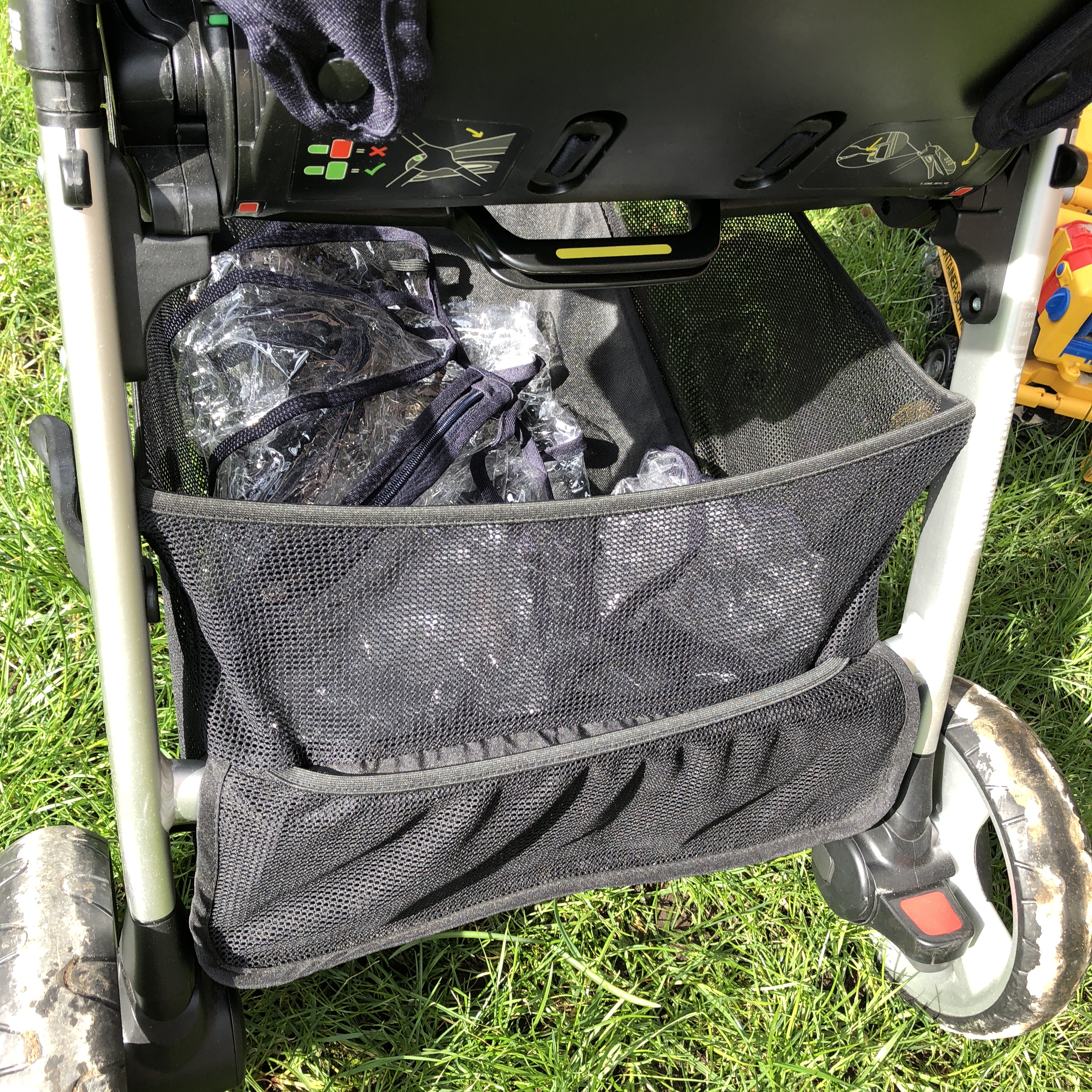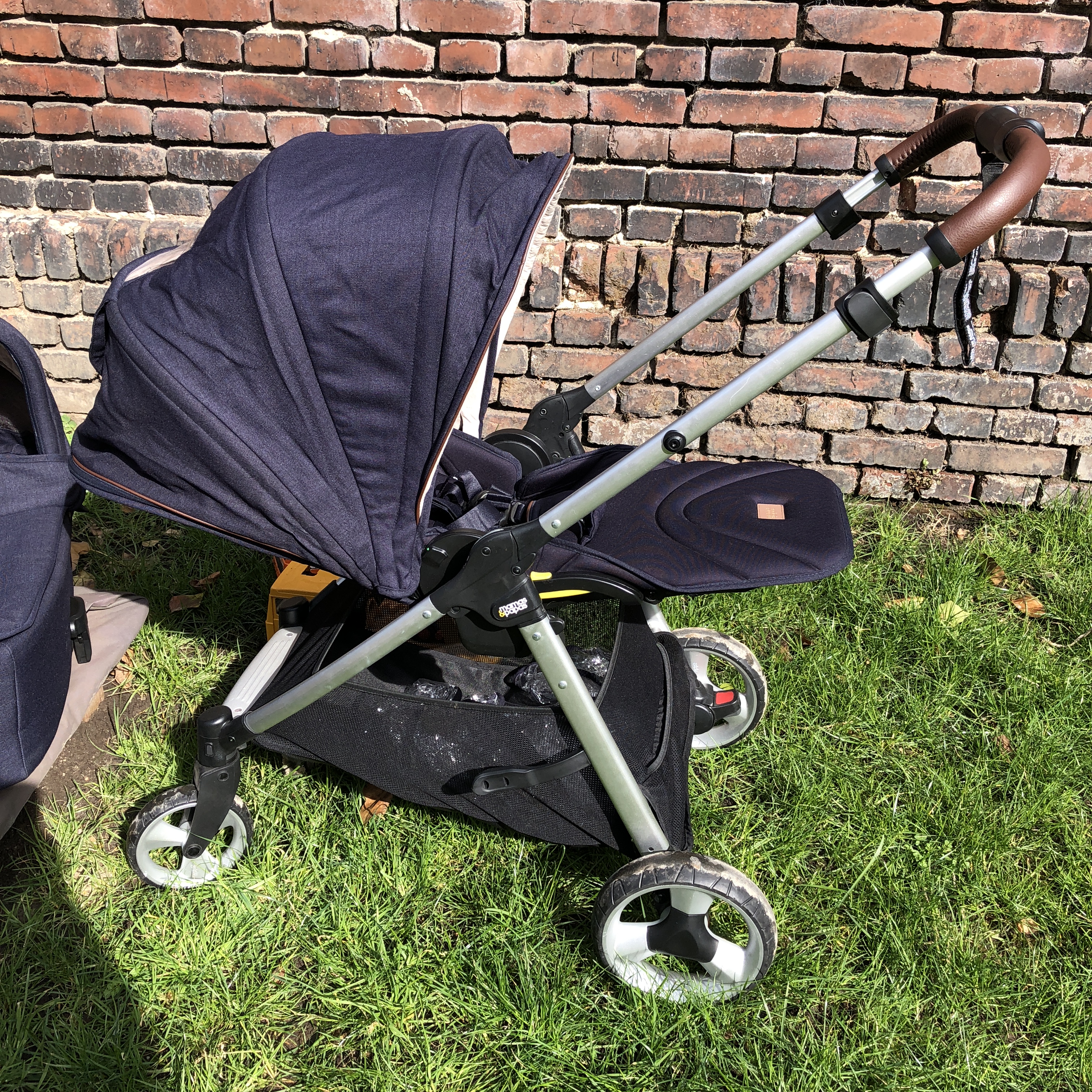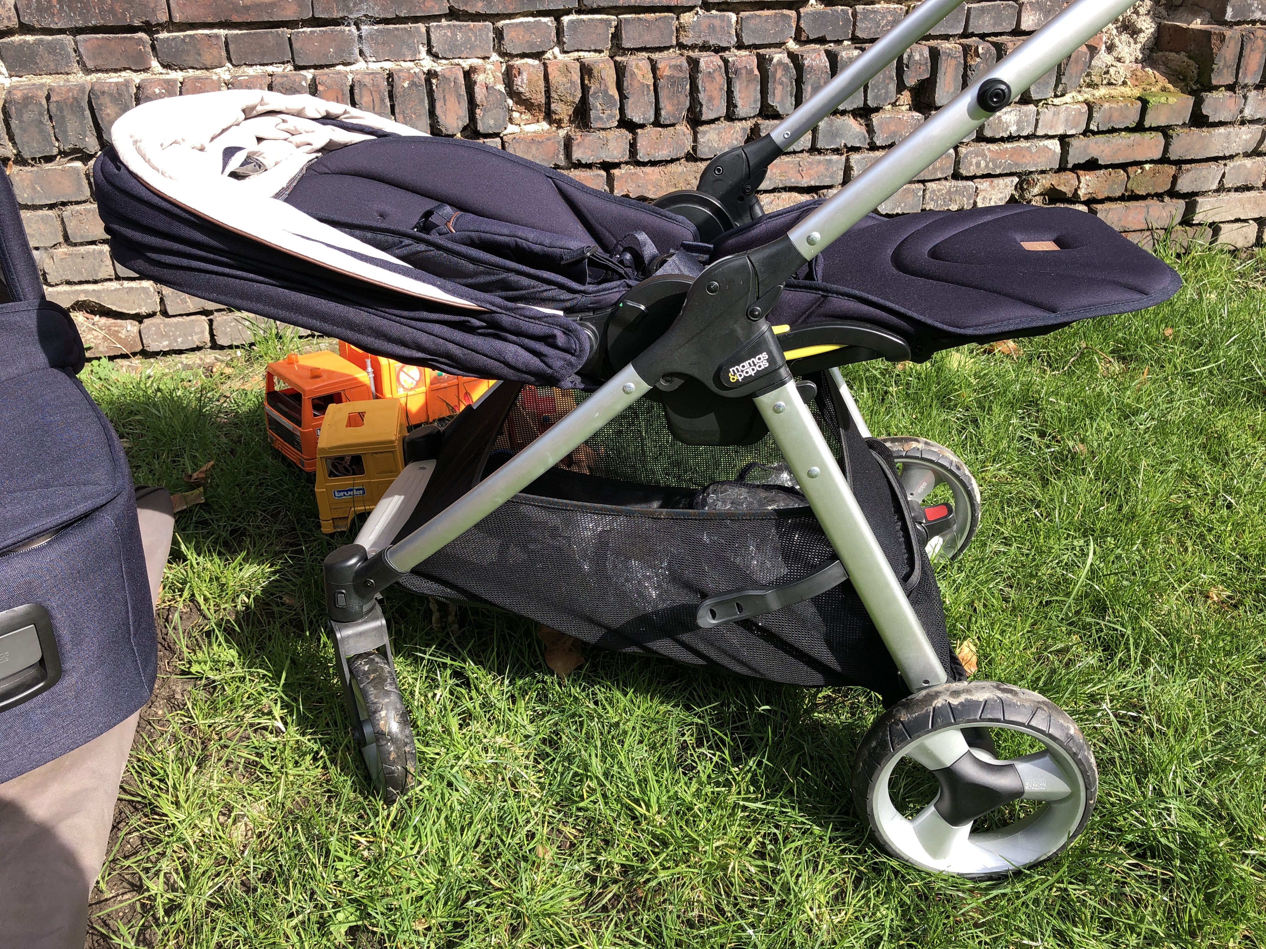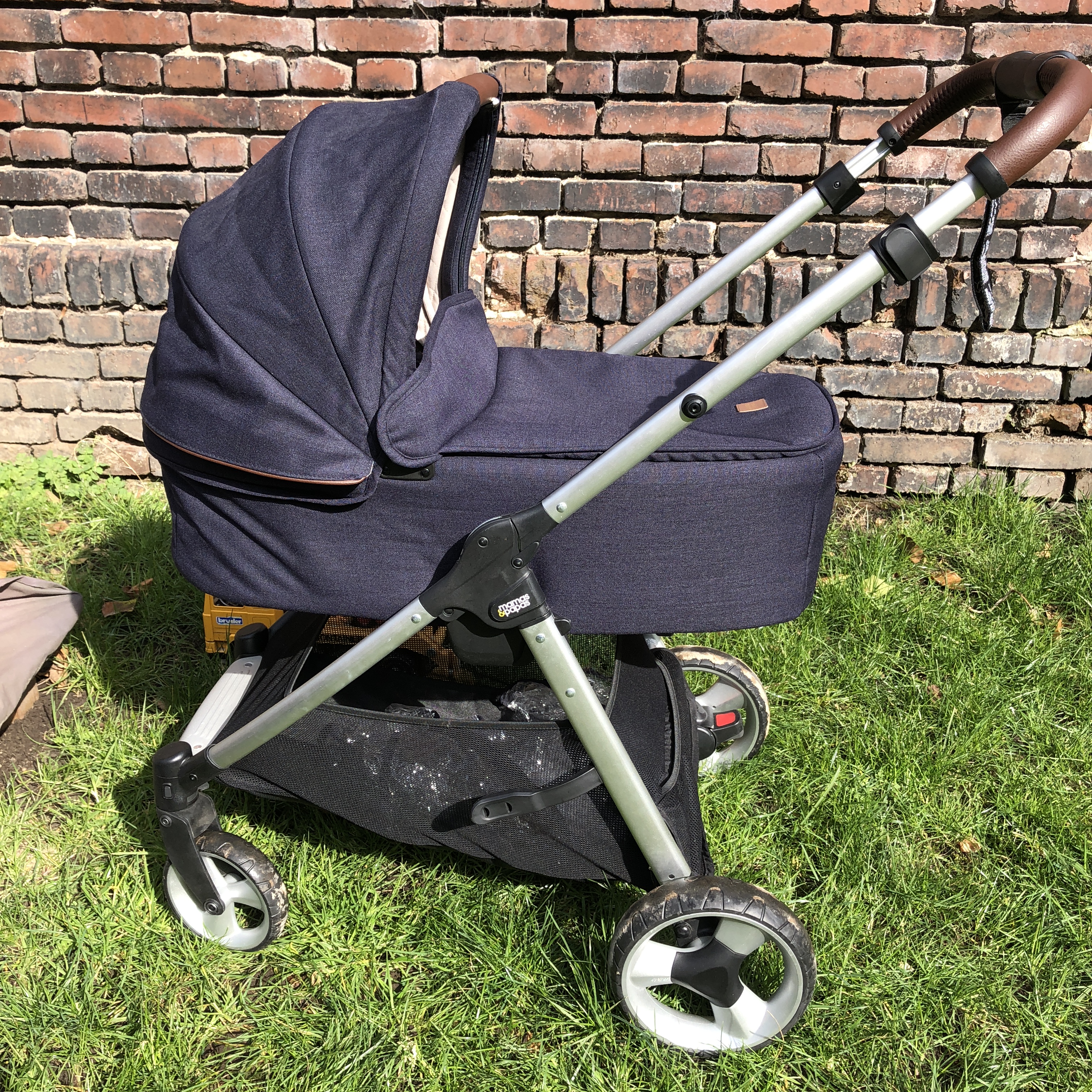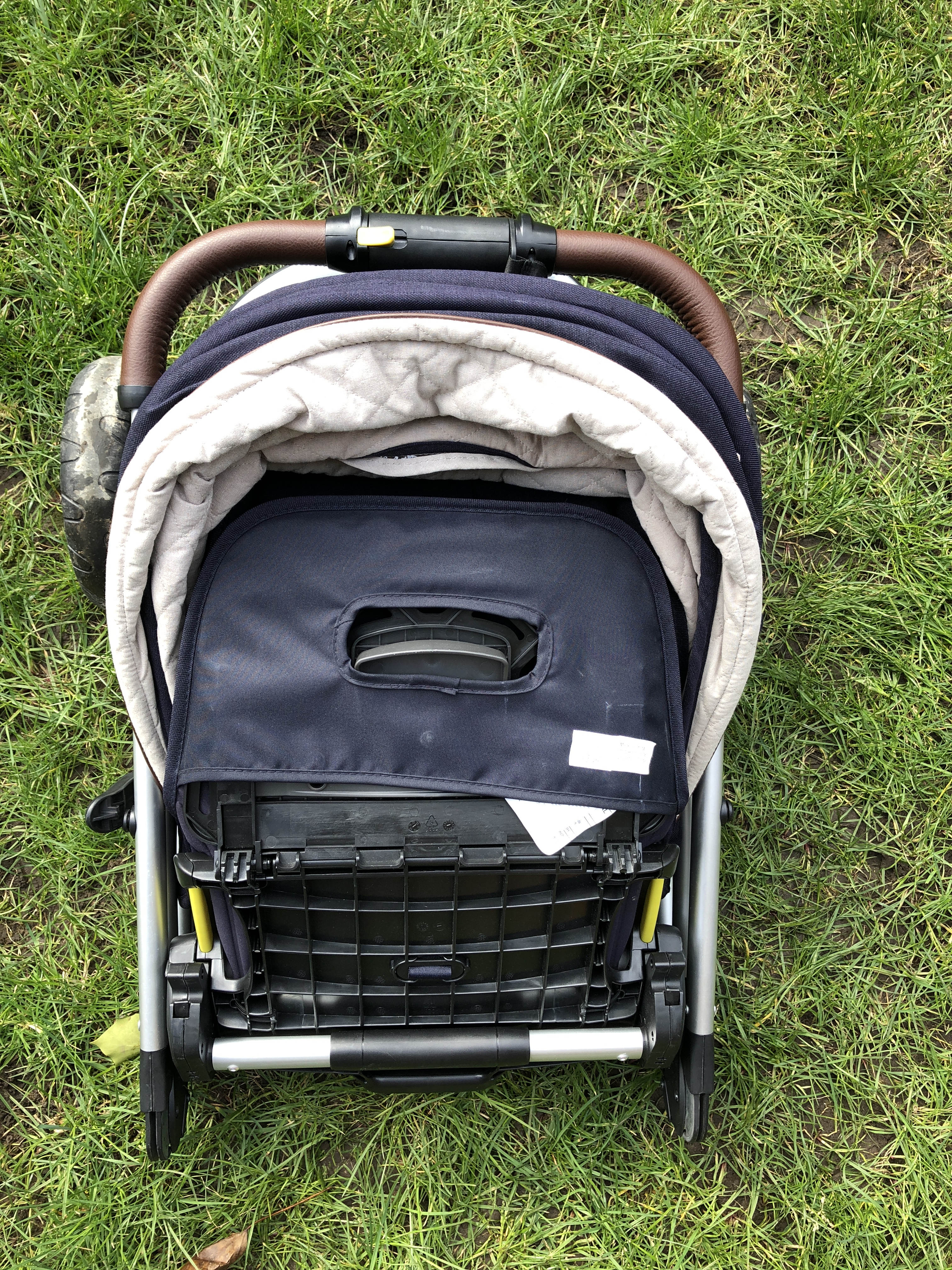 Der Mamas & Papas Armadillo Flip XT hat ein stabiles Gestell und nicht zu kleine und relativ breite Räder, die sich wie Vollgummi anfühlen. Am Gestell angebracht ist die Bremse, die man mit dem Fuß einfach bedienen kann und man bringt wahlweise den Sitz oder die Babywanne an. Auch mit dem in beide Richtungen montierten Sitz lässt sich das Gestell des Mamas & Papas Armadillo Flip XT einfach sehr klein zusammen klappen. Das Gewicht wird von Mamas & Papas mit etwa 10kg angegeben, er fühlt sich auch wirklich leicht an und hat einen Tragegriff und eine Transportsicherung, wenn er geklappt ist. Der Schieber ist mit dem bei Mamas & Papas üblichen qualitativ hochwertigen vernähtem Kunstleder bezogen und fasst sich angenehm an. Generell macht der ganze Wagen einen sehr stabilen Eindruck und ist offiziell bis 15kg belastbar. Ebenfalls gut finde ich den sehr großen Einkaufskorb, der auch mit Sitz gut zugänglich ist und wo mein Einkauf locker rein passt.