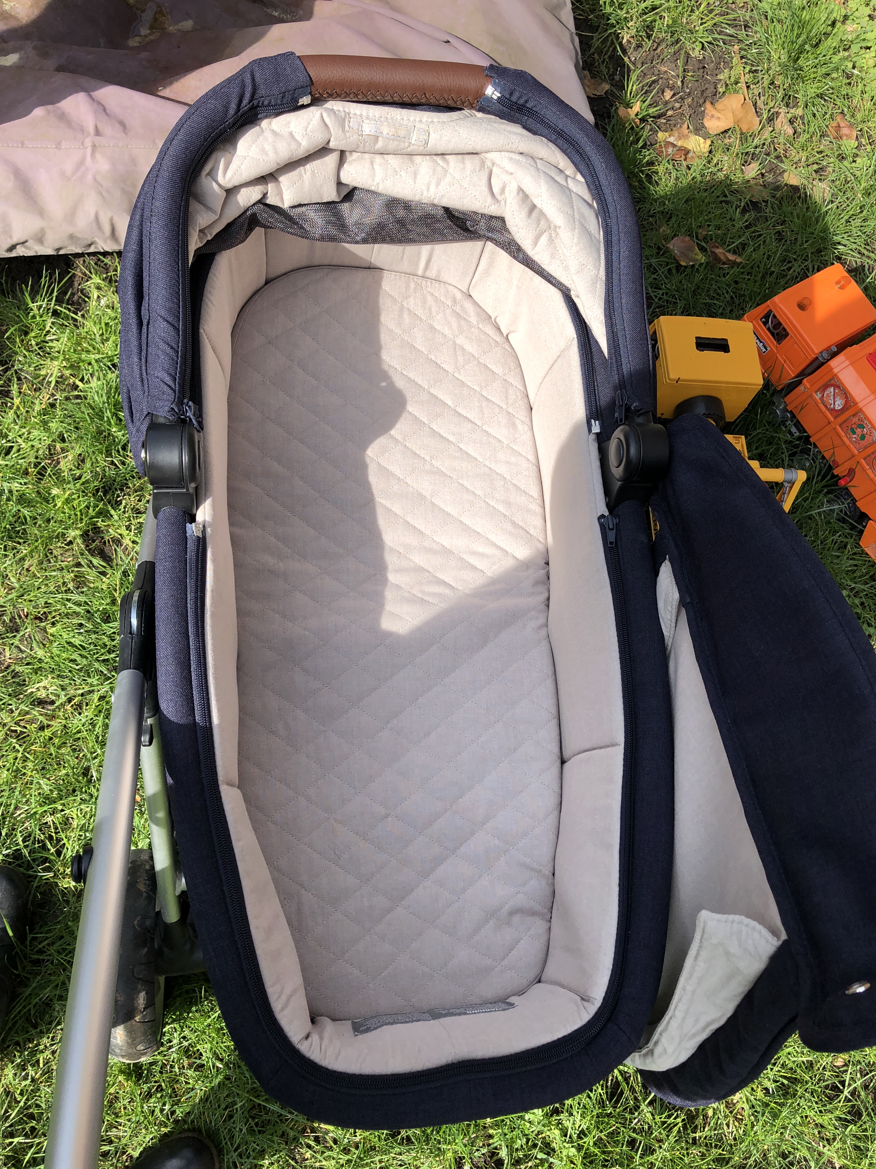 Englisch summary: As I absolutely loved the Mamas & Papas Urbo2 stroller I was curious to try the Mamas & Papas Armadillo Flip XT as well although I had heard some criticism but also read great reviews. Now we had the chance to try this stroller ourselves. And I was pleasantly surprised. While it isn’t as easy to push as the Urbo2 on really even surfaces it is easy to push on pebbles and cobbled streets and on most surfaces you might end up on. It is not a one-finger-push but easy to steer. I liked the high quality fabrics and luxurious details as the leatherette handlebar. The chassis is sturdy and the seat offers comfort and space. The Mamas & Papas Armadillo Flip XTs sun canopy is brilliant, it is just huge and offers a mesh-fabric behind a zip and the little „window“ to see your kid when forward facing. You can use the seat in both directions and other than the Urbo2 you can fold it down with the seat attached either way. You can make the Armadillo Flip’s seat rather flat for nap-time and the footrest is quite long as well so it fits older children, too. The Mamas & Papas Armadillo Flip XTs shopping basket is on the big side as well and my grocery shopping plus nappies and other stuff fit in it and it is easy to reach. The only thing I do miss is a bumper bar to attach books and toys for my toddler. The newer Flip XT appears to have one though. In my opinion the Mamas & Papas Armadillo Flip doesn’t really fit the „buggy“ category it is more a pushchair/stroller with a lot of comfort. The carrycot has a good size as well and what I especially liked it that you can easily remove all fabrics and wash them, very handy with a baby. The rain cover is included and you can also buy loads of other accessories as well.