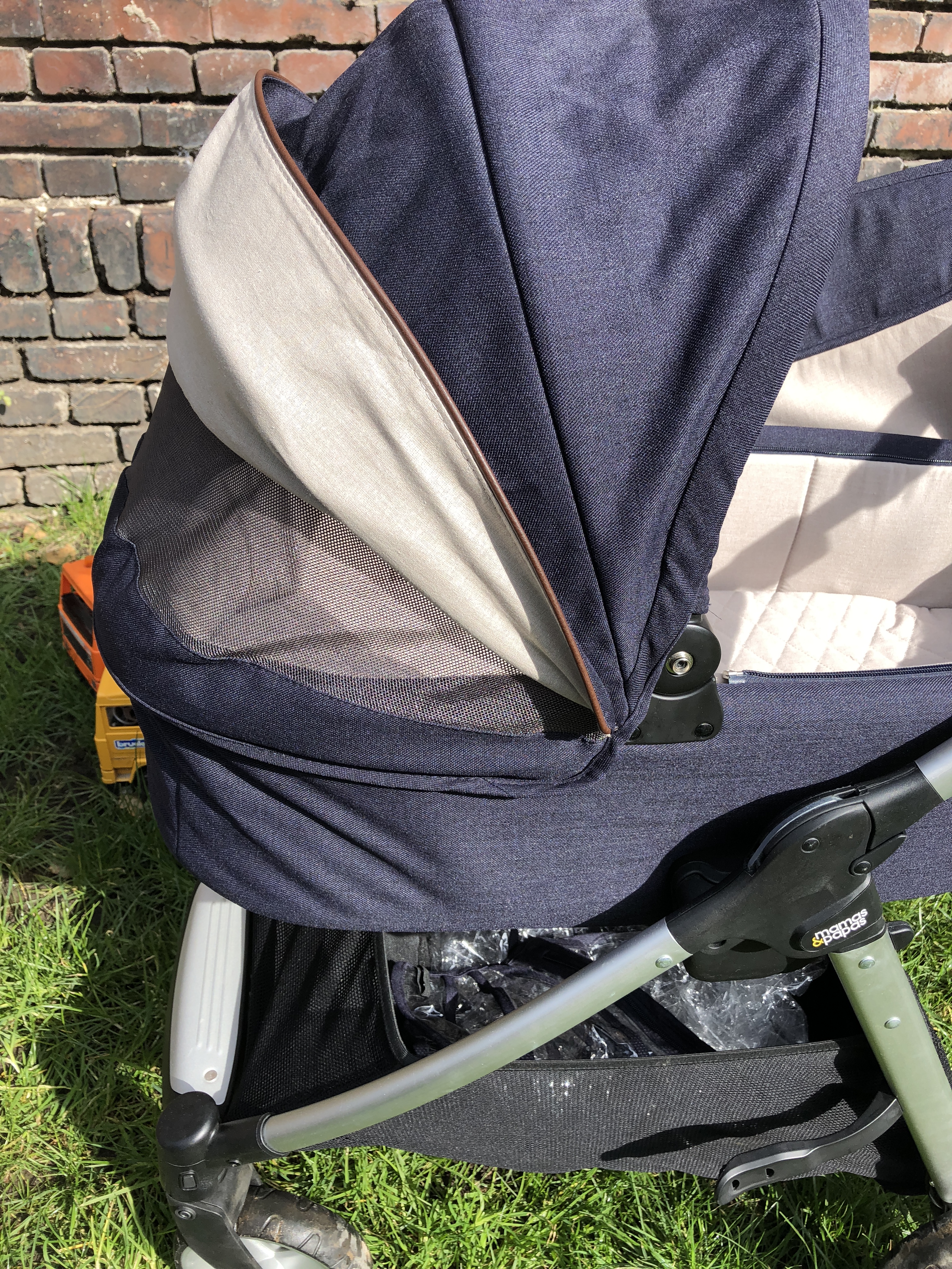 Das Sonnendach des Mamas & Papas Armadillo Flip XT ist riesengroß, außerdem innen schön beige gesteppt und es hat sowohl hinter einem Reissverschluss Meshmaterial zur besseren Belüftung im Sommer als auch ein kleines „Fenster“, falls man sein Kind auch vorwärts fahrend ansehen will.