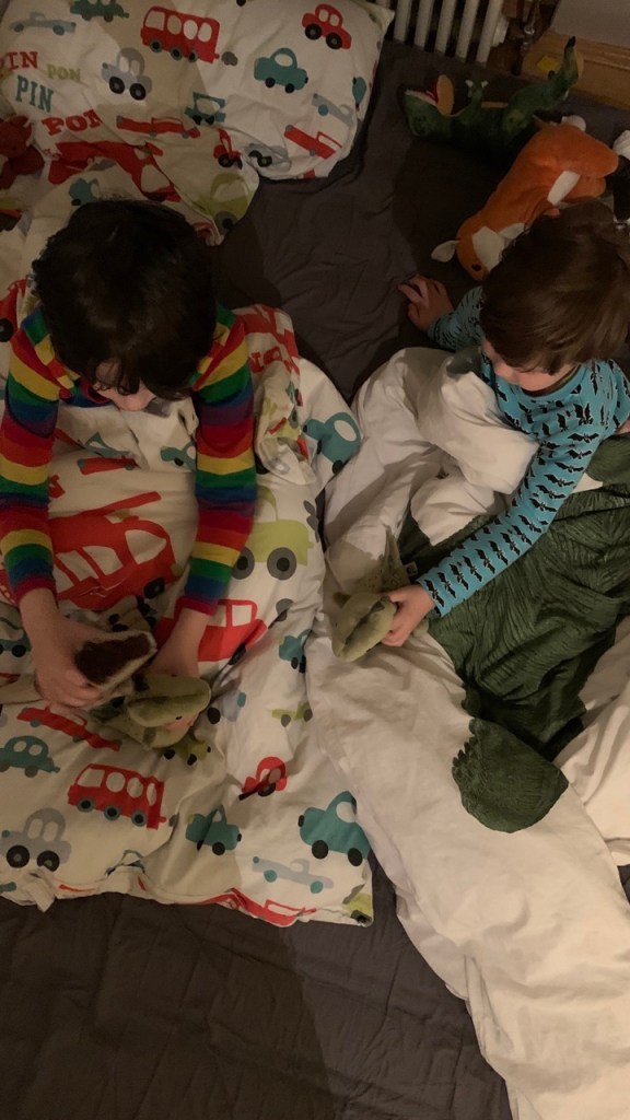 Bizzidad liest noch den Kleinen vor, der Große liest im Wohnzimmer auf dem Sofa und ich gucke noch „The Irregulars“ weiter.