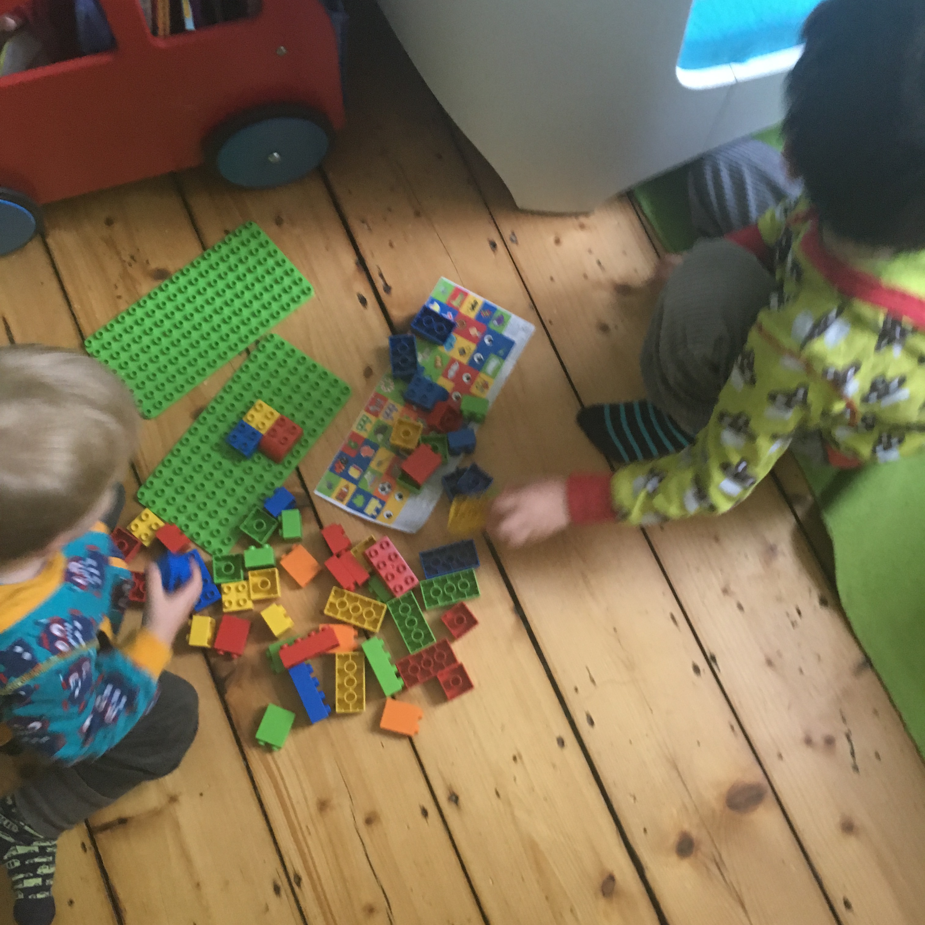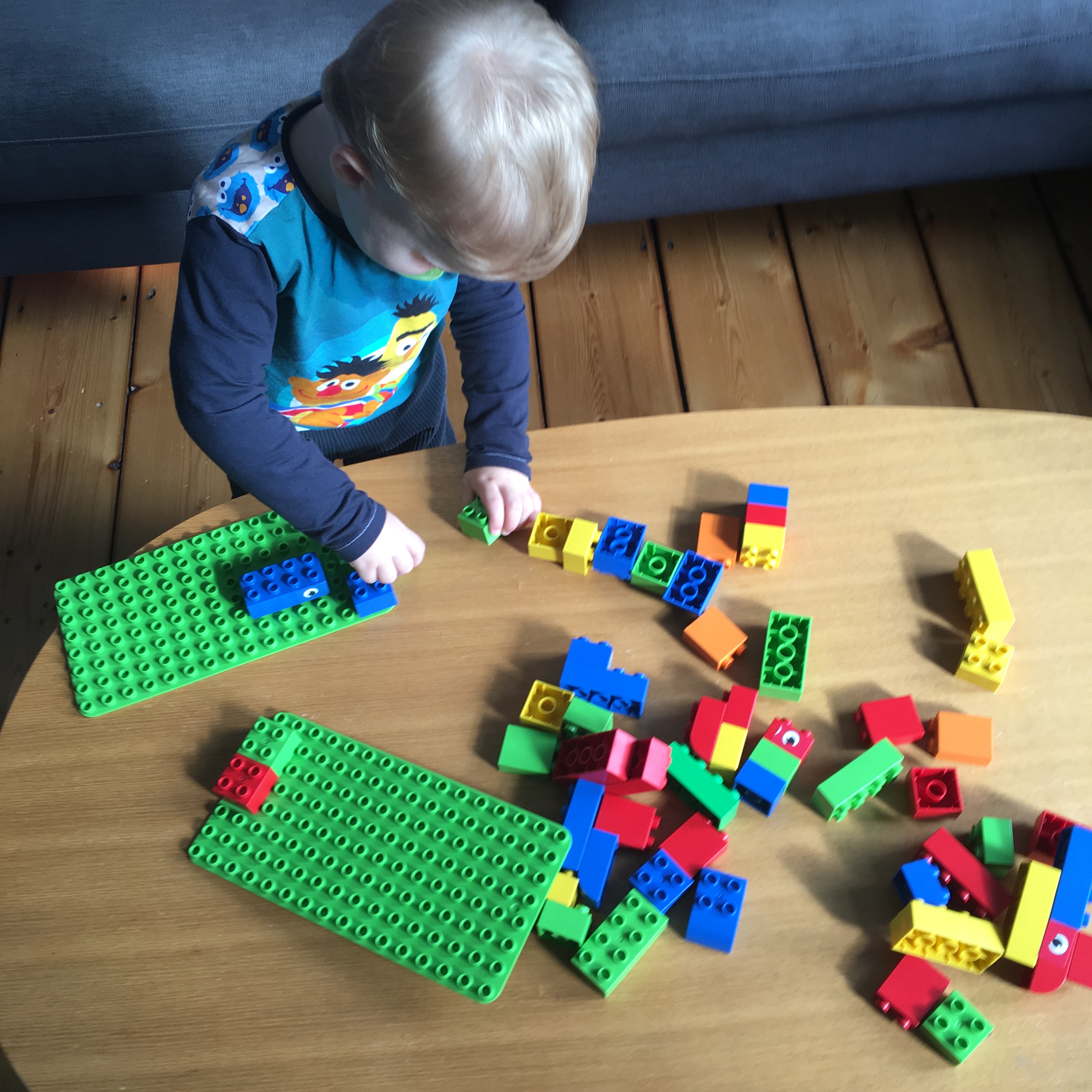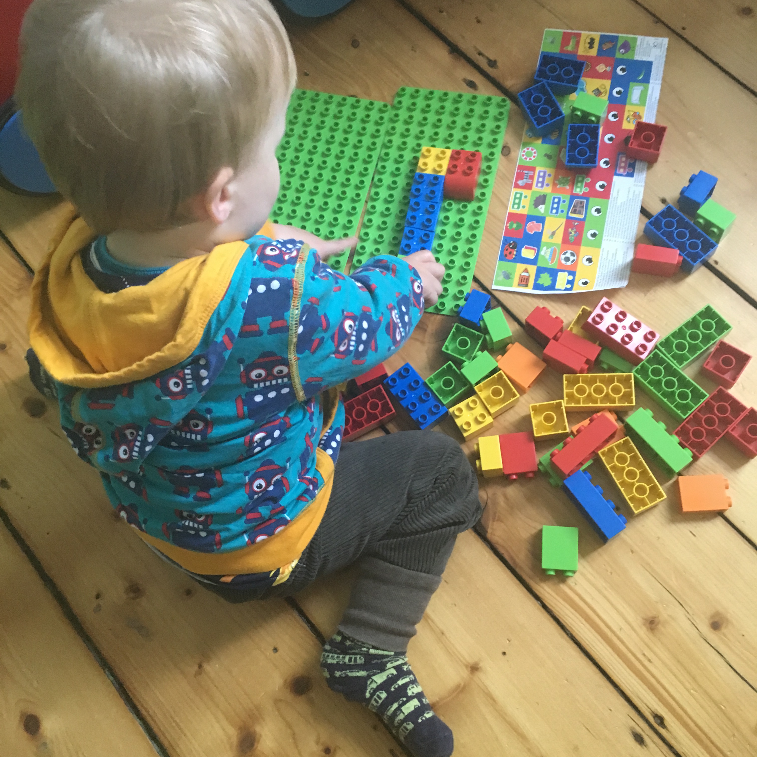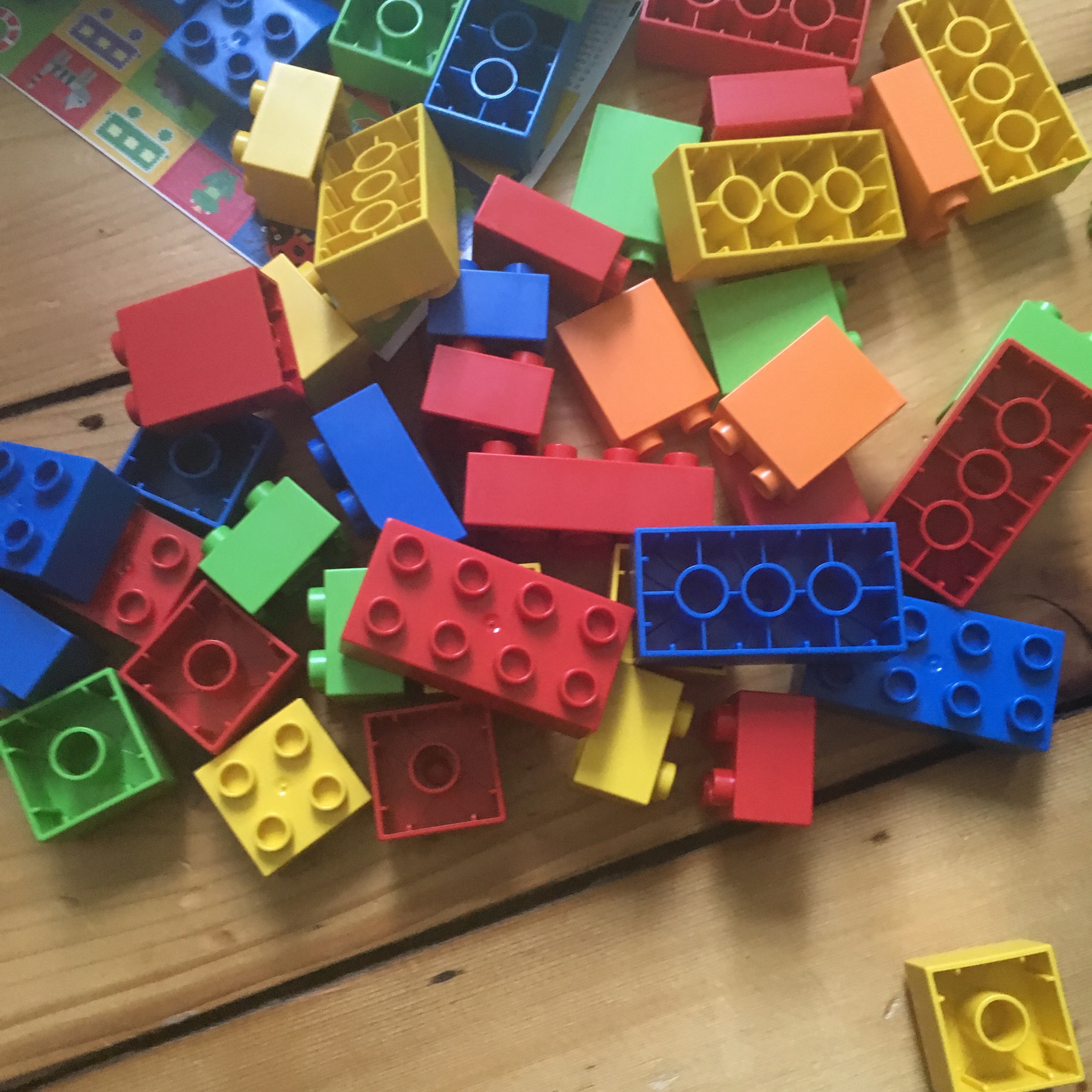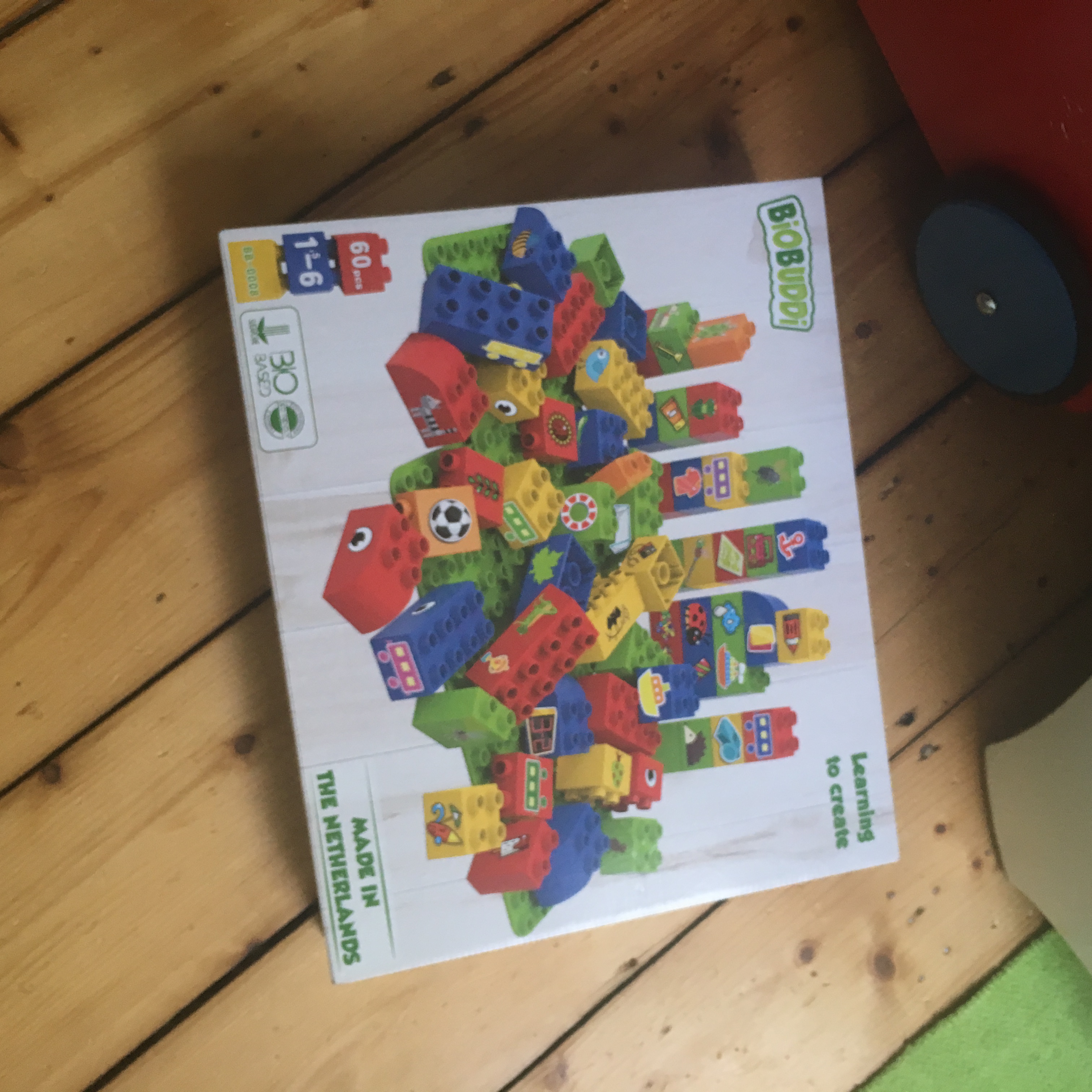 My kids couldn’t care less about it being environmental friendly (well, the eldest at 8 years does) and it being safe for kids. For them the product itself counts. My youngest helped himself to a box and was allowed to keep it. At home he grabbed it and unpacked immediately. It absolutely matches the better known (well, Biobuddi is brand new) Lego Duplo building blocks (photo of my son holding two green blocks – one Duplo, one Biobuddi above) the fit. My son mentioned that he prefers the feeling and surface of the Biobuddi building blocks, in his words „they just feel better“, we guess it’s because they have a better grip. So if you own another brands building blocks you can just get Biobuddi additionally. So far there are only blocks available and no cars or figurines, so we mix and match. On our recent holiday to Ireland my youngest brought the Biobuddi building blocks and his Duplo cars. There are different sized boxes available starting with 40 blocks, we got the box with 60 blocks. The blocks themselves are great quality the stickers aren’t so adhesive though (as they are also eco-friendly), we don’t mind, we use them without the stickers. Children older than my 2-year-old probably won’t try and remove any sticker you put on them anyway.