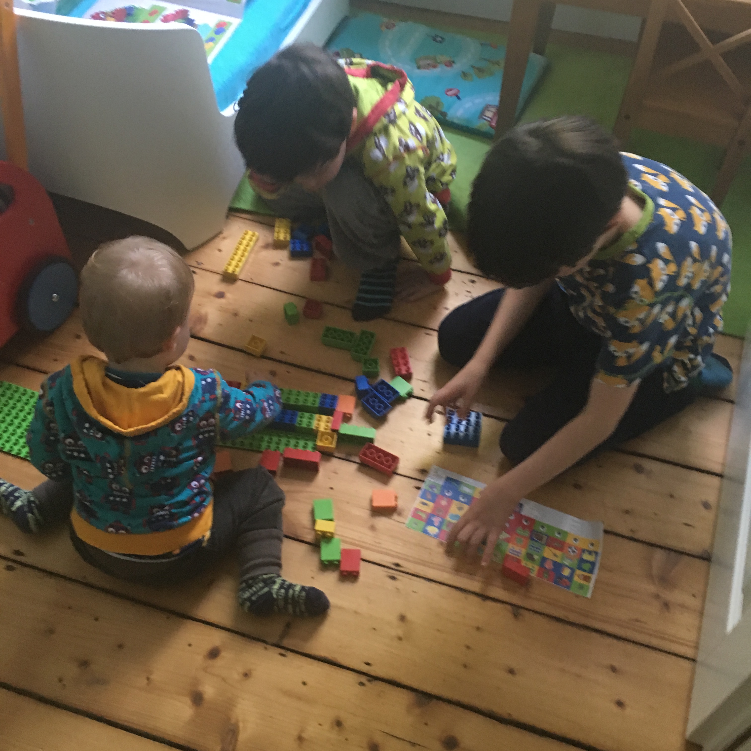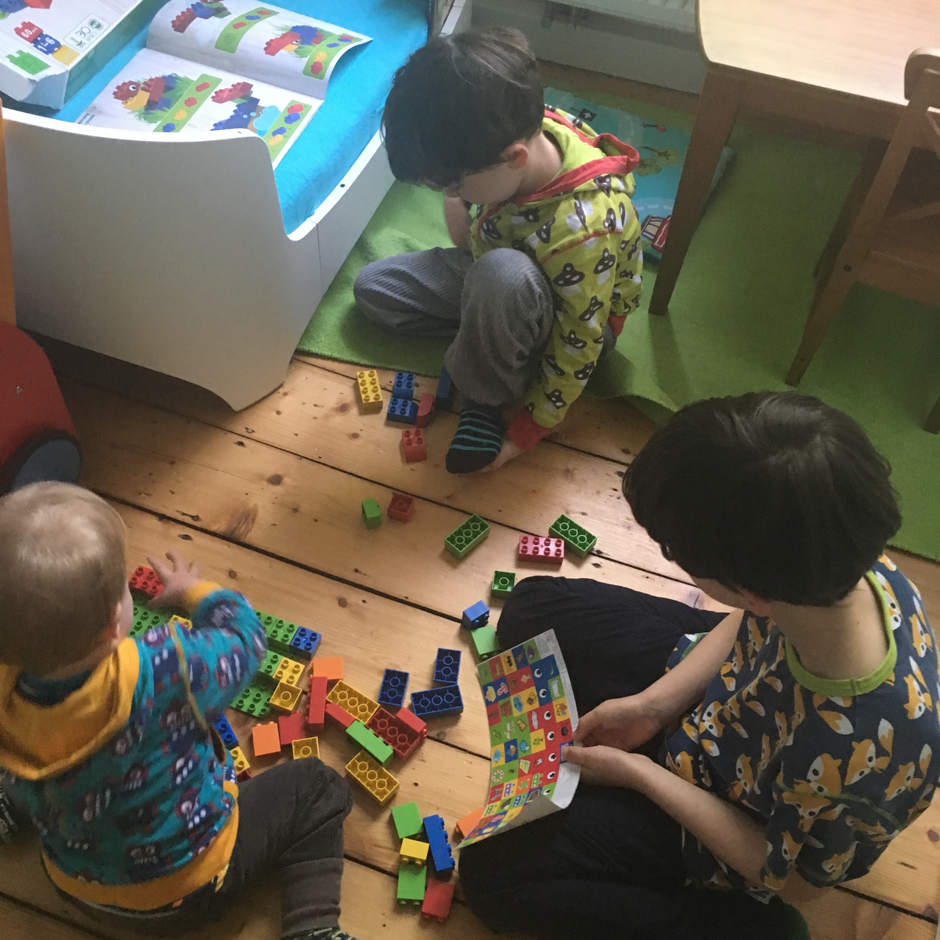 Zuhause wurde uns der Biobuddi Karton entrissen und alle drei Jungs (fast 2, 5 und 8 Jahre) fingen an zu bauen. Der Kleinste baut einfach Steine zusammen, der Mittlere nahm sich die beiliegende Anleitung mit Bauideen und baute sie direkt nach und der Große, eindeutig mein Sohn, beäugte die Bausteine erst mal kritisch und verglich sie mit den vorhandenen. Kinder sind immer die ehrlichsten Kritiker.