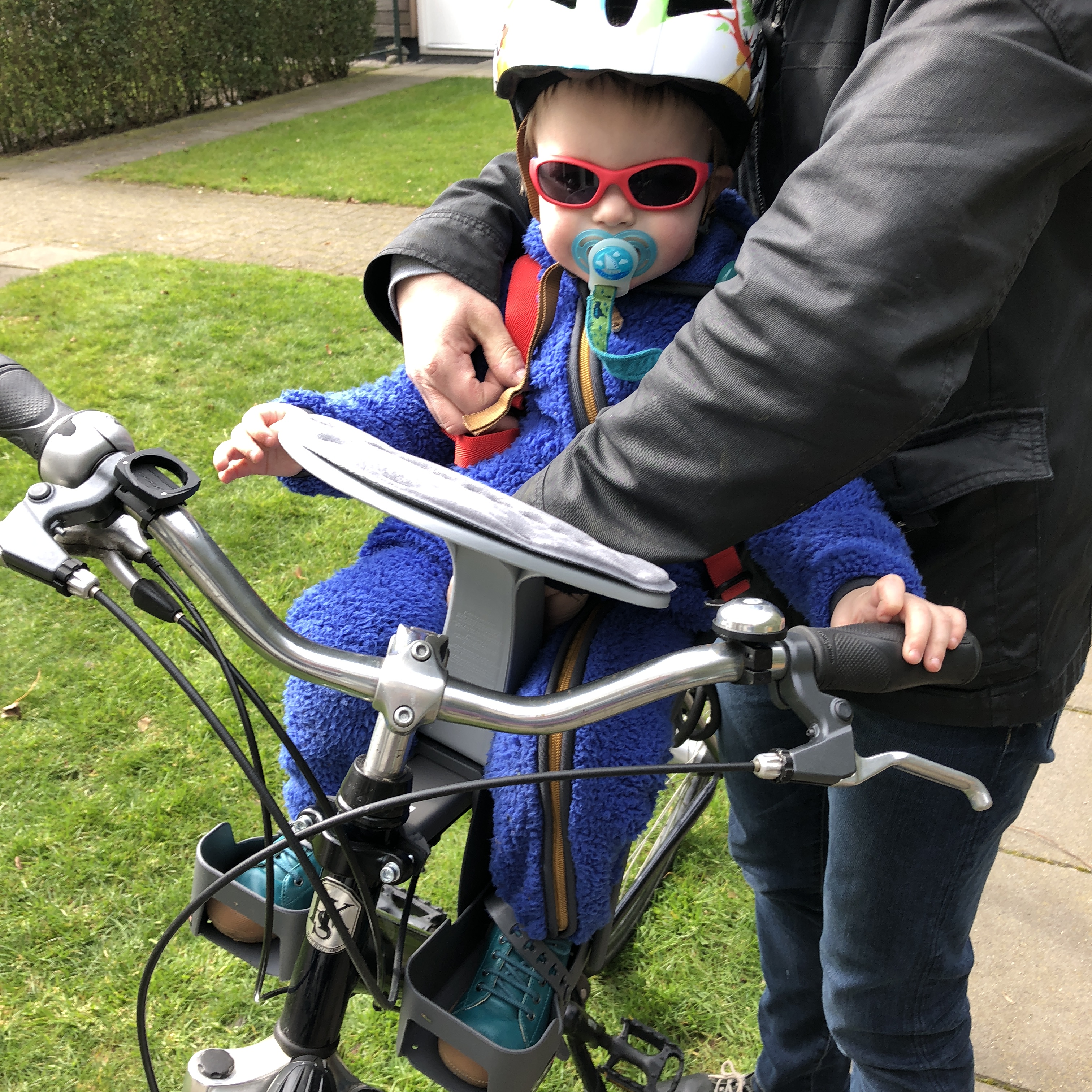 Der Weeride Sitz sah auf den ersten Blick total klein aus, ist aber bis 15kg und eigentlich bis 3-4 Jahre. Als unser Sohn dann drin saß, fanden wir den Weeride Sitz überhaupt nicht mehr „klein“, sondern genau richtig. Auch die Fußstützen passen noch prima für seine relativ großen Füße. Die Gurte des Weeride sind leicht zu bedienen und auch einfach zu verstellen und die beiden Schultergurte kann man dann noch mit einem Klettriemchen verbinden, so dass sie nicht verrutschen (wenn der Papa das nicht grad vergisst). Sich selbst befreien konnte er auf jeden Fall nicht und sie drückten auch nicht.