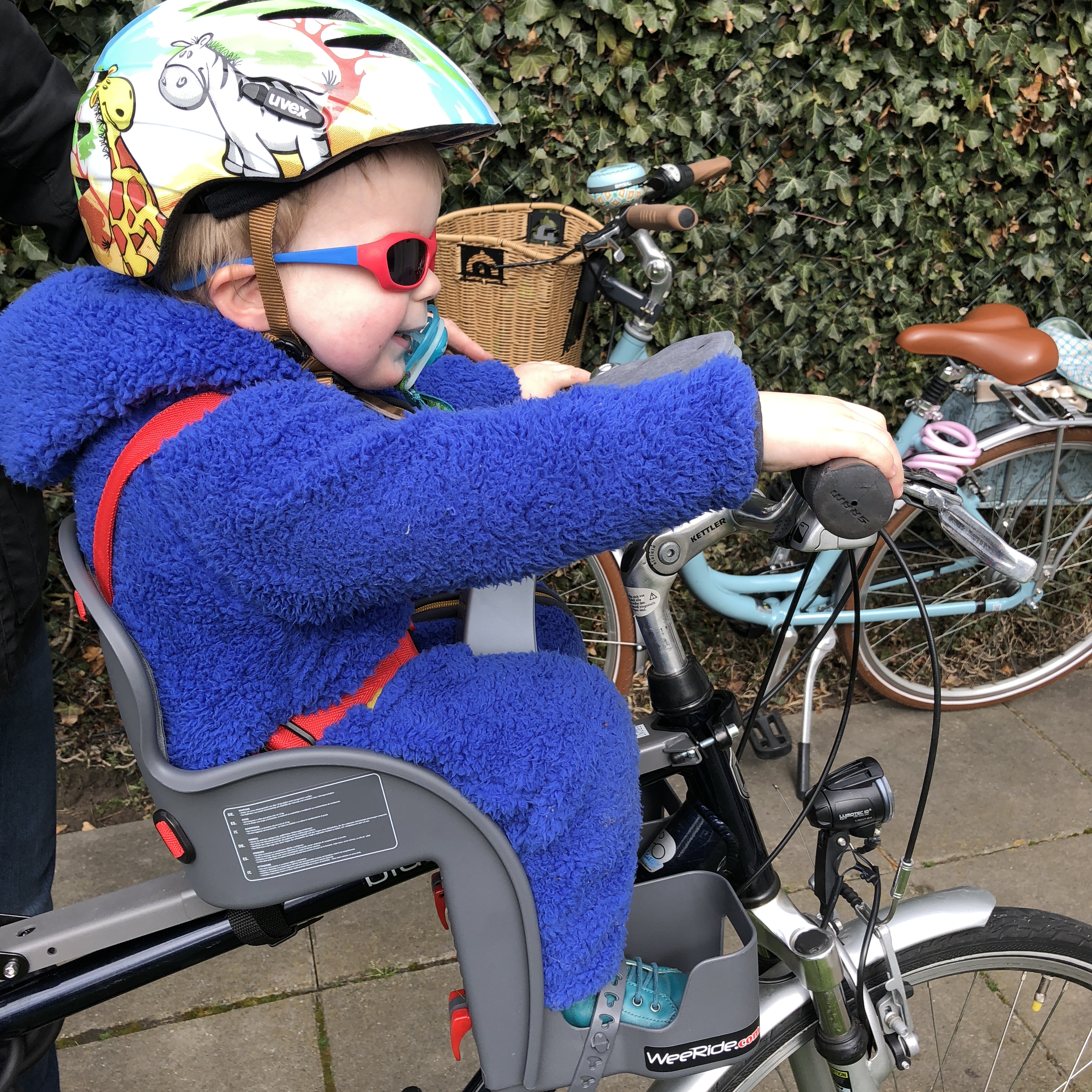 Wir finden den Weeride Fahrradsitz wirklich gut und ich würde ich auch privat kaufen. Für uns hat der Transport des Kleinkinds vorne große Vorteile, man sieht das Kind, das Kind sieht mehr und man hat auf oder am Gepäckträger eben auch Platz für „Gepäck“ und kann einen Rucksack tragen. Bei einem Fahrradsitz hinten haben wir immer Probleme gehabt, da man eben weder etwas am Gepäckträger gut transportieren kann, noch einen Rucksack aufsetzen.