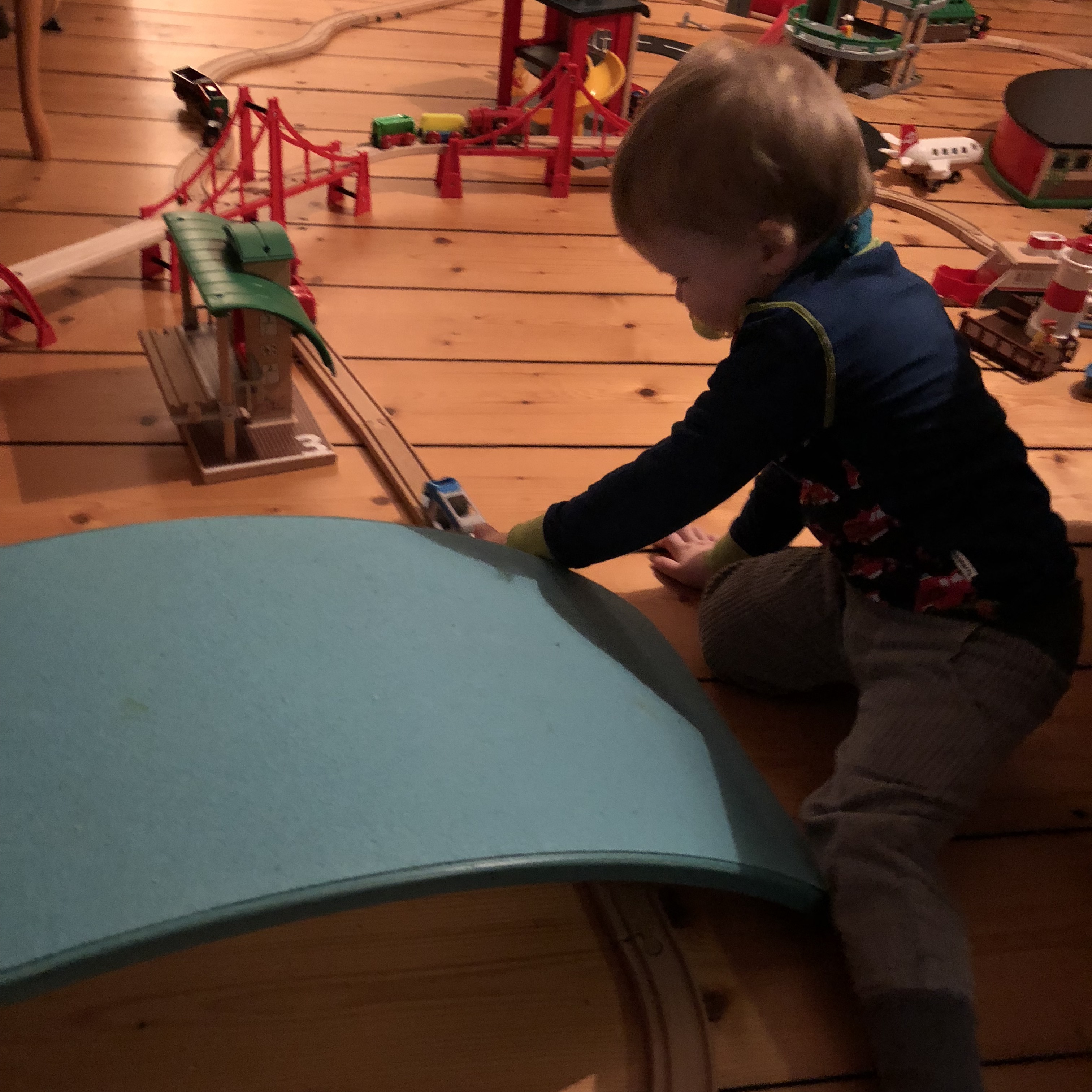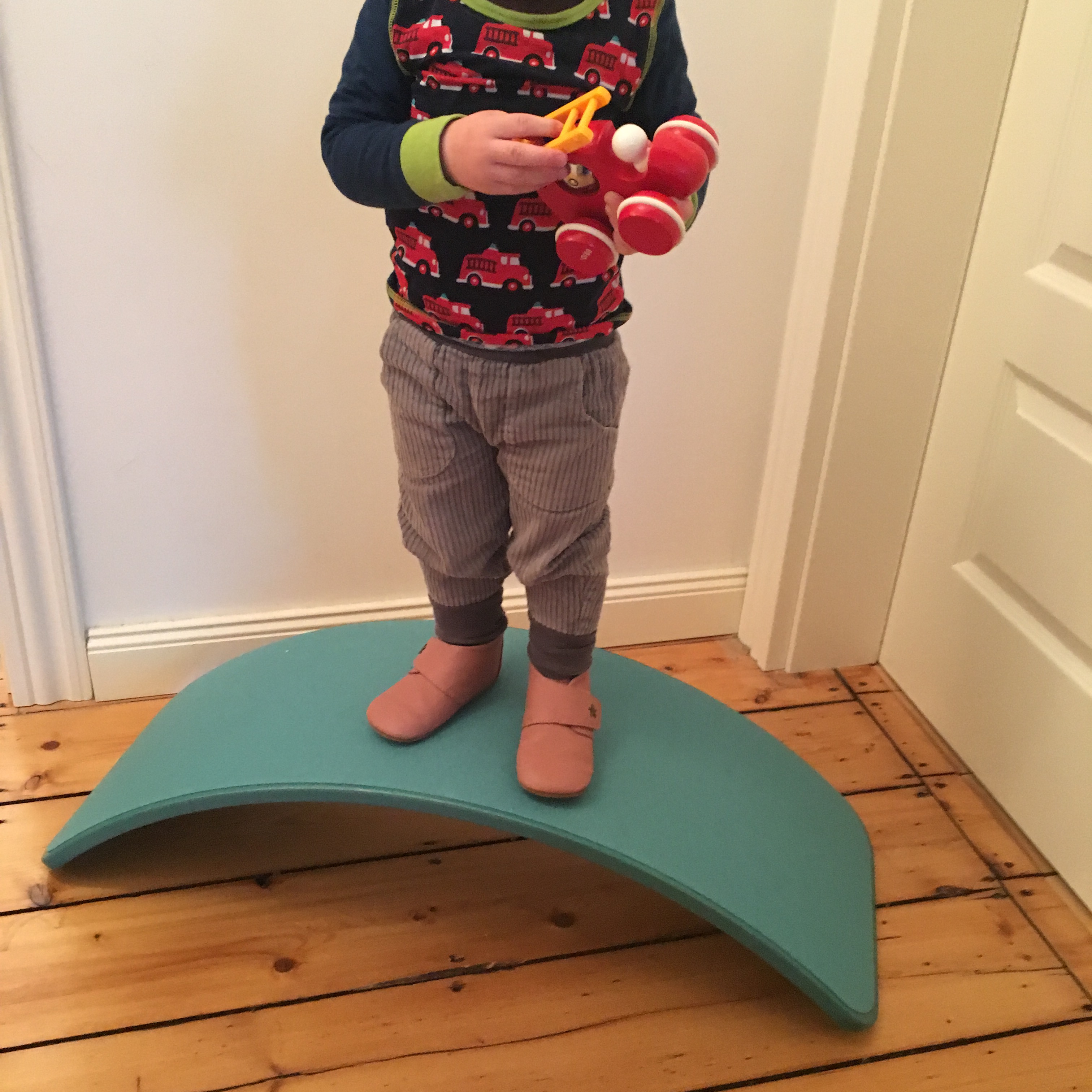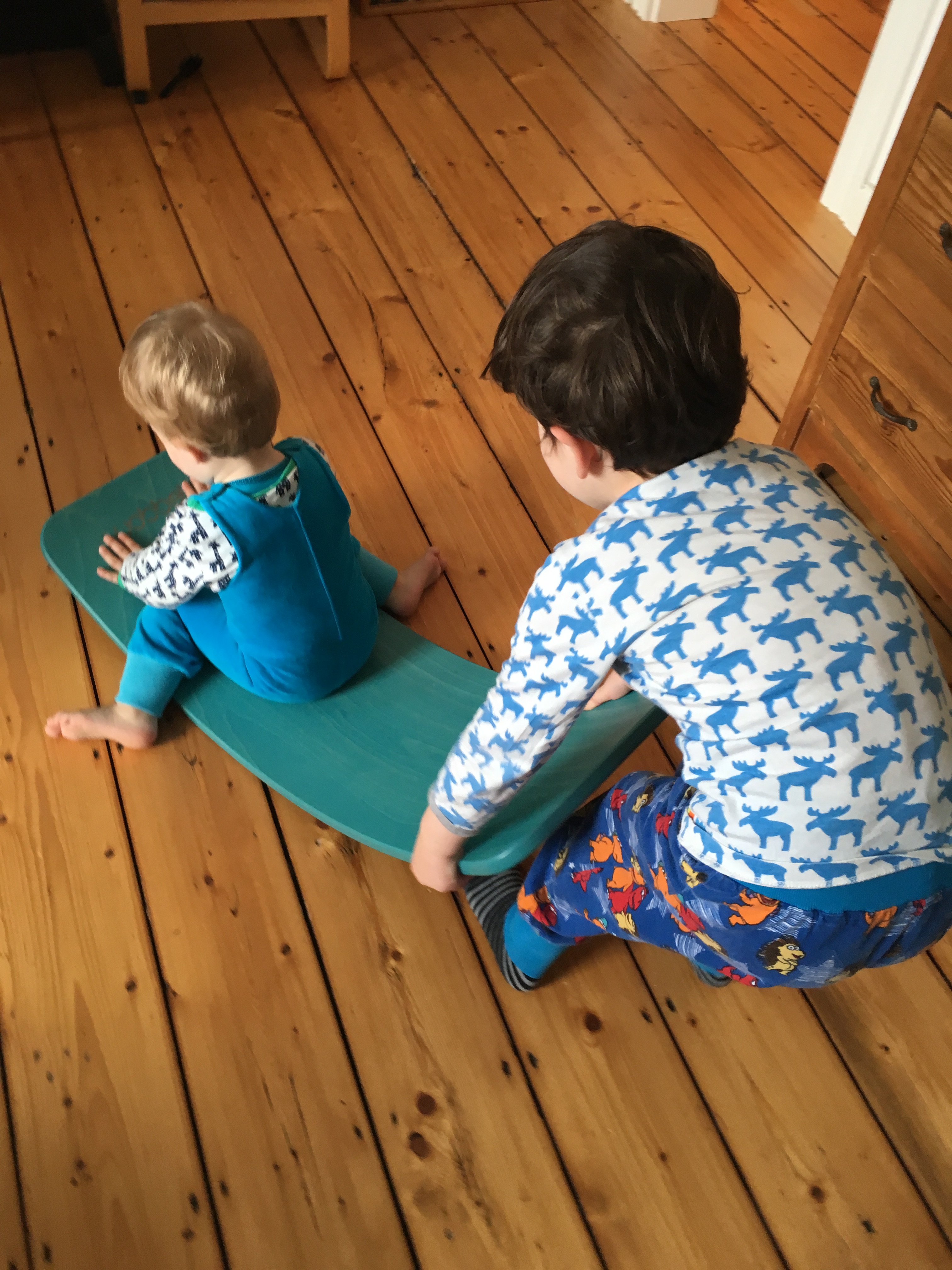 Wir möchten bei uns beide Wobbelboards nicht missen. Der Große hat sein eigenes XL, das in seinem Zimmer steht und er steht immer wieder zwischendurch auf dem Wobbel, er spielt besonders gern Snowboard. Das normale Wobbel steht im Wohnzimmer und wird von den beiden Kleineren dauernd benutzt, ob als Wippe, Rutsche oder um darauf zu Wobbeln. Neulich war es eine Brücke bei der Eisenbahn oder es ist die Abschussrampe für Spielzeugautos. Der Große bezieht das Wobbel weniger ins Spiel ein, für ihn ist es eher Sportgerät.